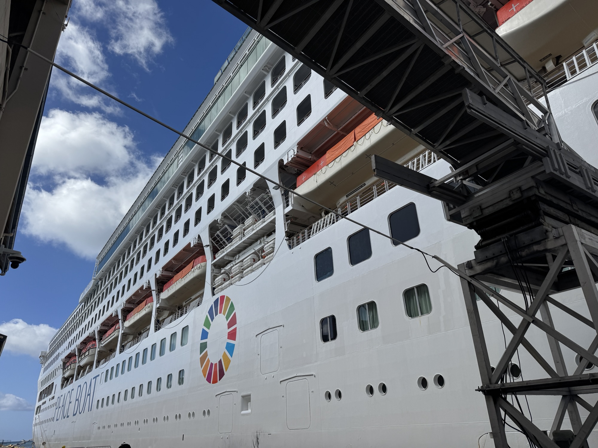 実は船に乗ってる人の中で、「あ、素敵な人」って思ったら大抵はピースボートスタッフだ。若くて知的で可愛い。中でも通訳を担当する人たちは顔採用と思われる。いや、声も綺麗なんだけどね。その中の1人から、唐突に「いつも素敵ですけど、今日は一段とダンディですね」って言われた。嬉しくて眠れないかよ。