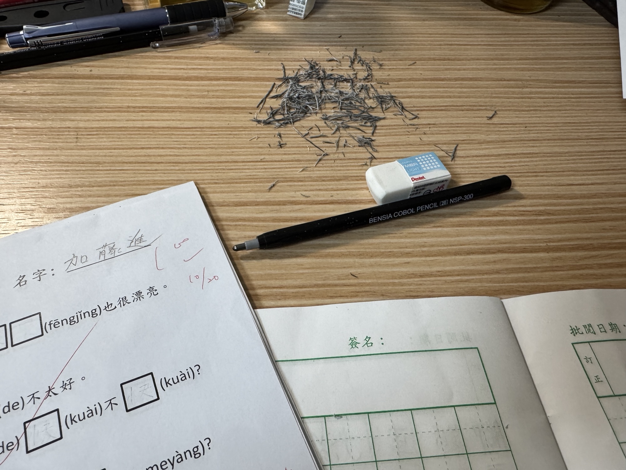 まさかアラ還でこんなに消しゴムを使うとは思わなかった。消しゴムってとても原始的なシステムだよね(笑)。このカスを何か有益に使えないだろうか…。今日第五課と第六課の中間テストなんだ。すげー頑張ってる。だって、他にすることないから。