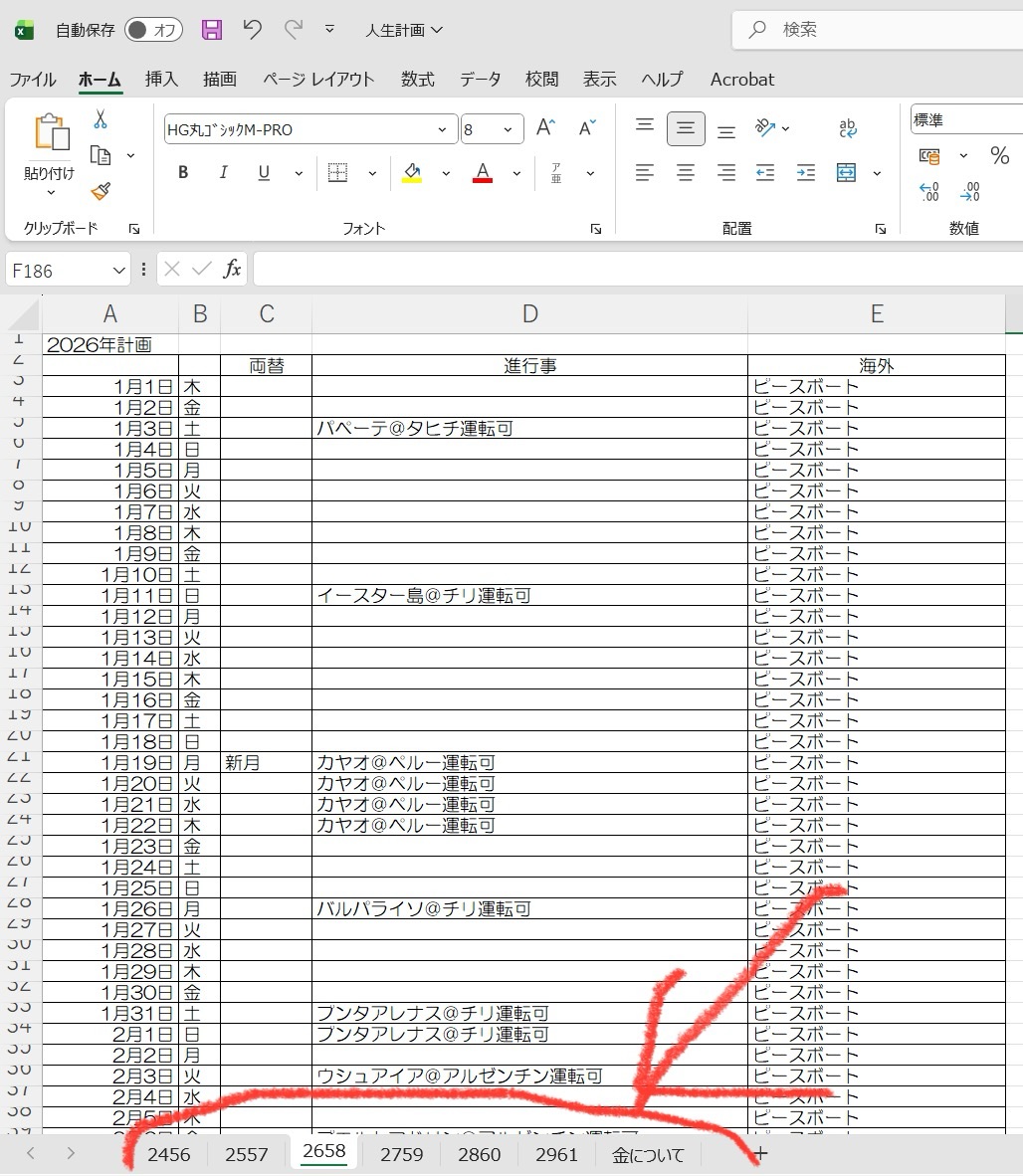 今は一人ぼっちであと43年生き続けるわけだが、2029年までのスケジュールが、緻密に組まれている。3日に1回くらいは眺めたり修正したりしている。変態的なスケジュール。画面下のタブの説明いる?最初の2桁が西暦の下2桁、後ろはその年の誕生日に私が成る年齢。とにかく、遊びたい。たった一度の人生。働いてる暇はない。ごめんなさい。