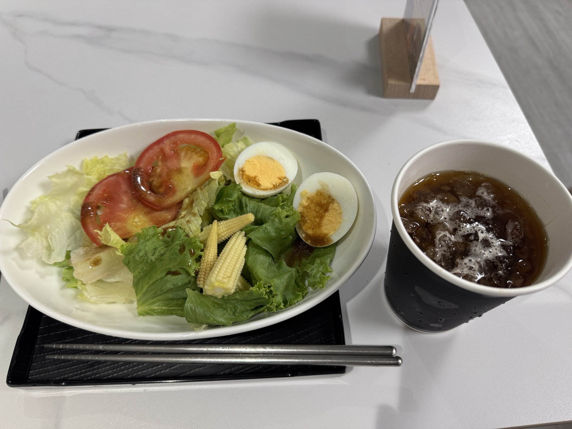 昨日、ホテルのフロントで朝食はどうするの?って聞かれて「インクルード(含まれてるの)?、免費嗎?(無料?)」って聞いたらそうだというのでお願いした。サンドイッチか台湾ご飯、どっちがいい?って聞かれて、パンもご飯も食べられない。炭水化物は食べられないんだってスマホで示し、アイスコーヒーとサラダだけでいいと話したらこうなった。パーフェクトだ。ケトン生活、楽しい。