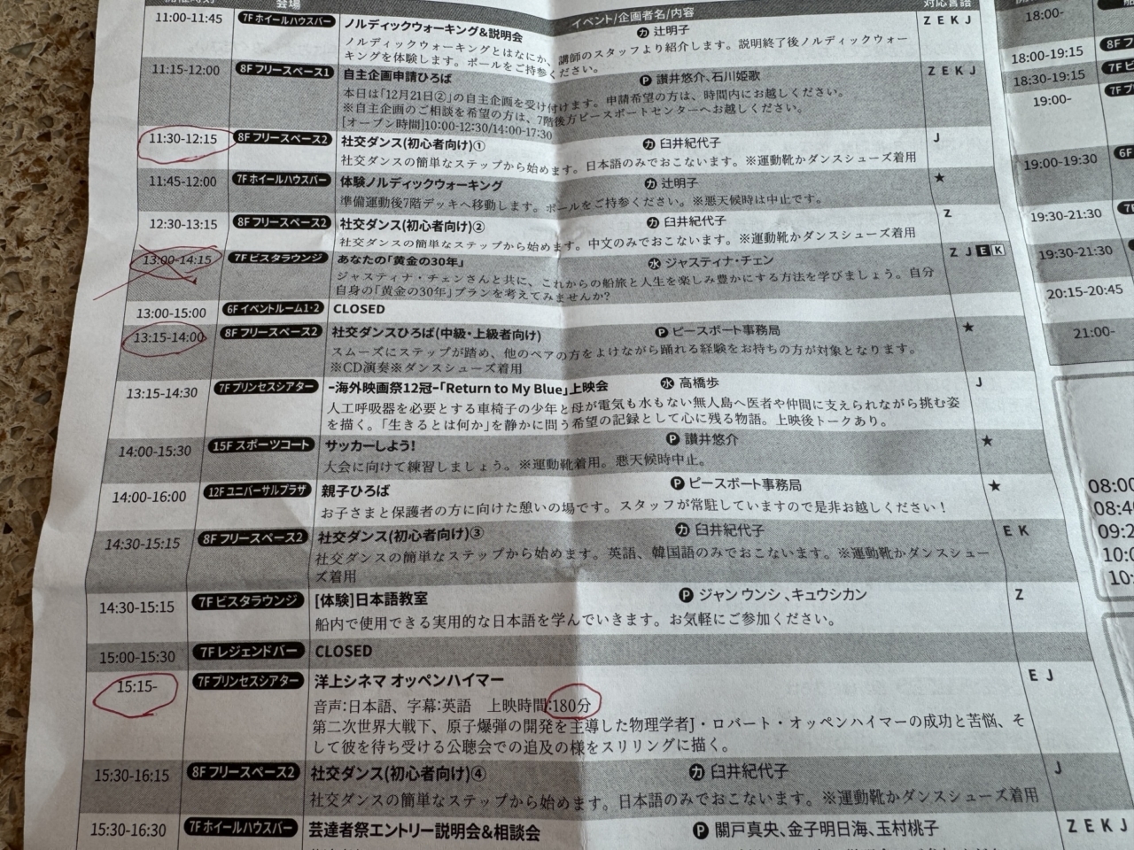 社交ダンス45分×2セット。映画一本。まだプログラムが少なくてつまらん。早く本来のピースボートになって欲しい。盛りだくさんの企画が欲しい。