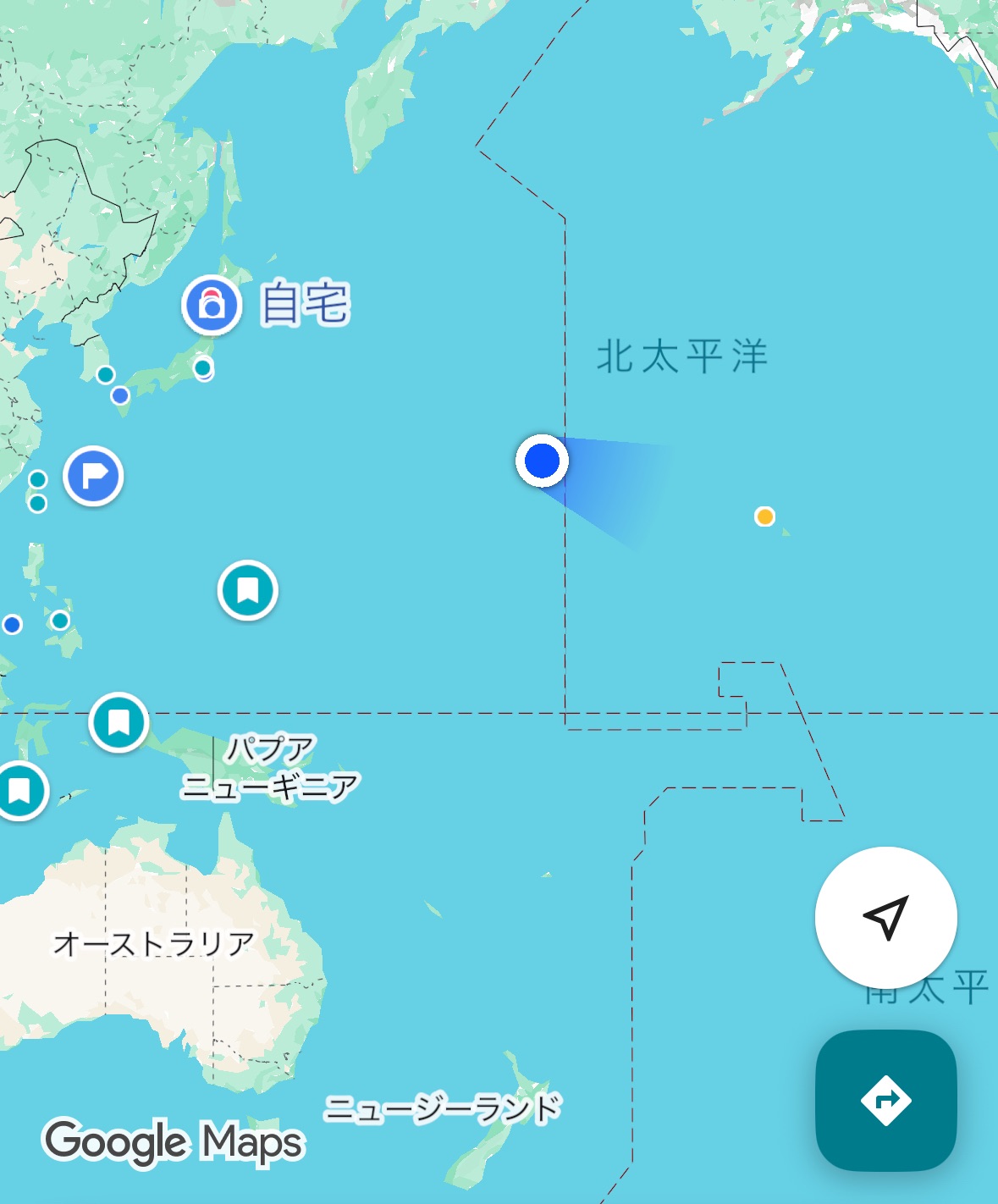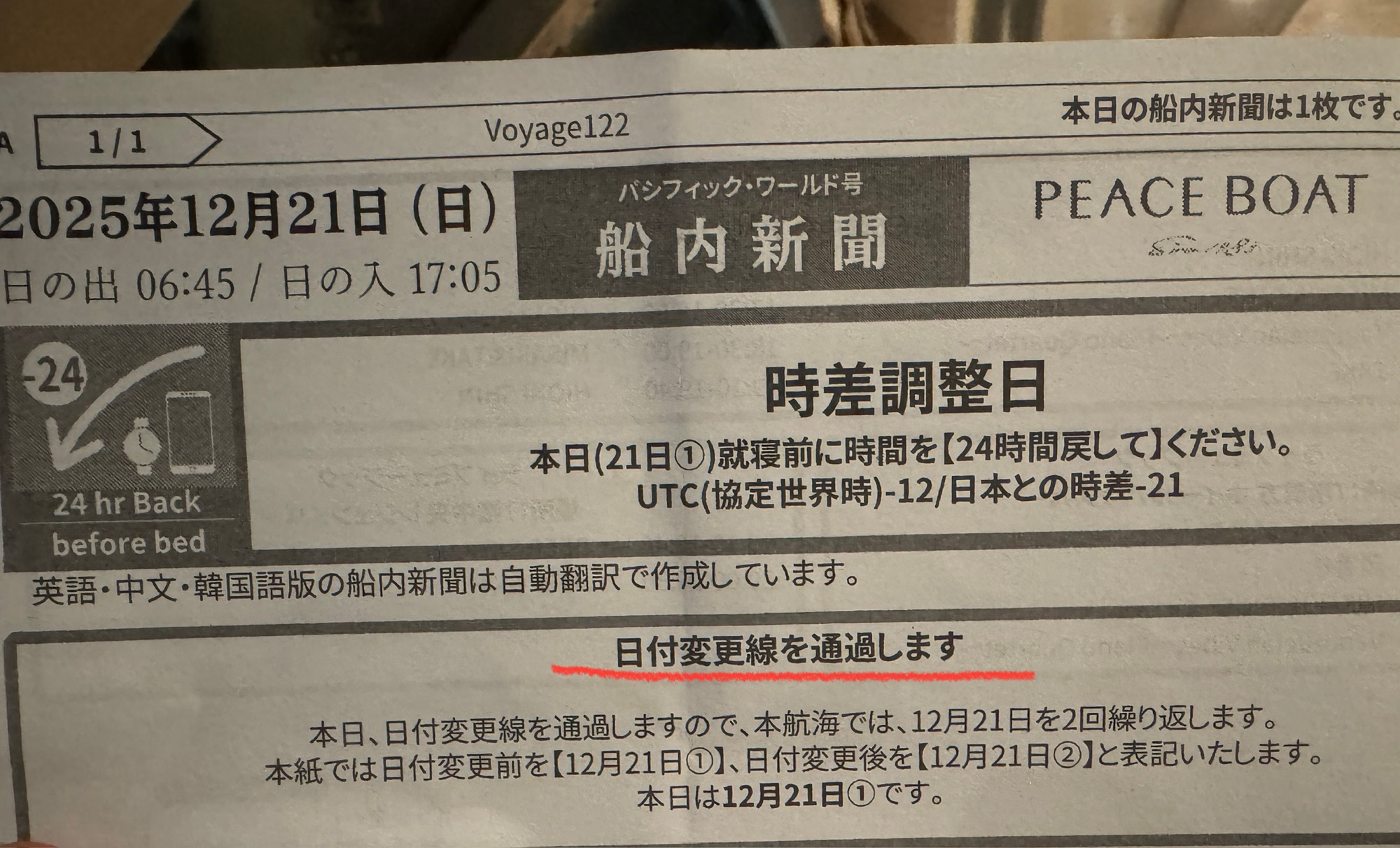 Googleマップで見ると、日付変更線が目の前に迫っていて、今日、そこを超える。船内ではどうなるかというと、今日が12月21日①、明日が12月21日②となる。今日は日本時間プラス3時間、明日は日本時間マイナス21時間だ。いつもは飛行機でブーンなので、船旅の醍醐味を味わう。