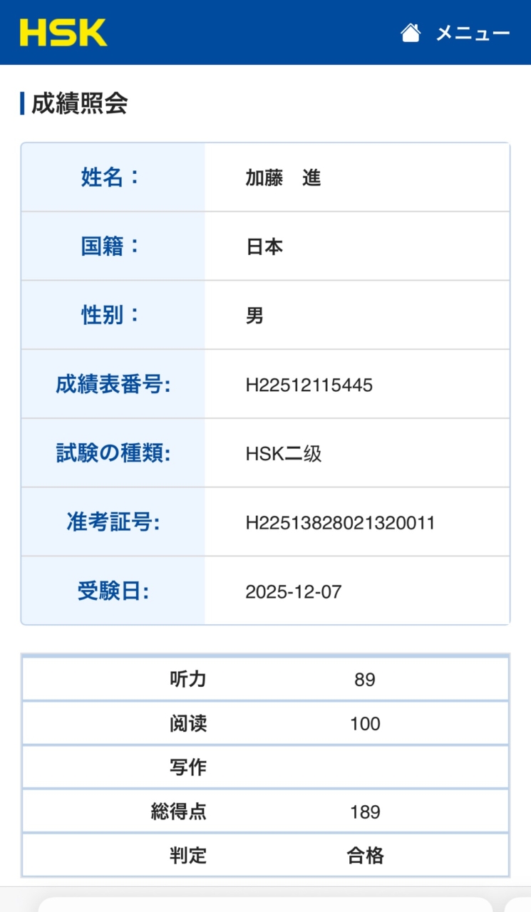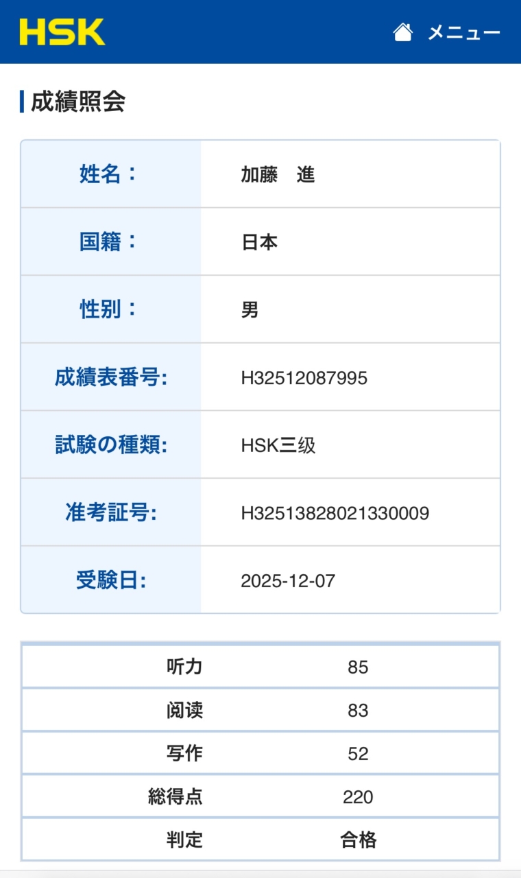 12/7に受けた中国語の検定試験の結果が発表された。二級も三級(より難しい)も合格してた。うえーい!