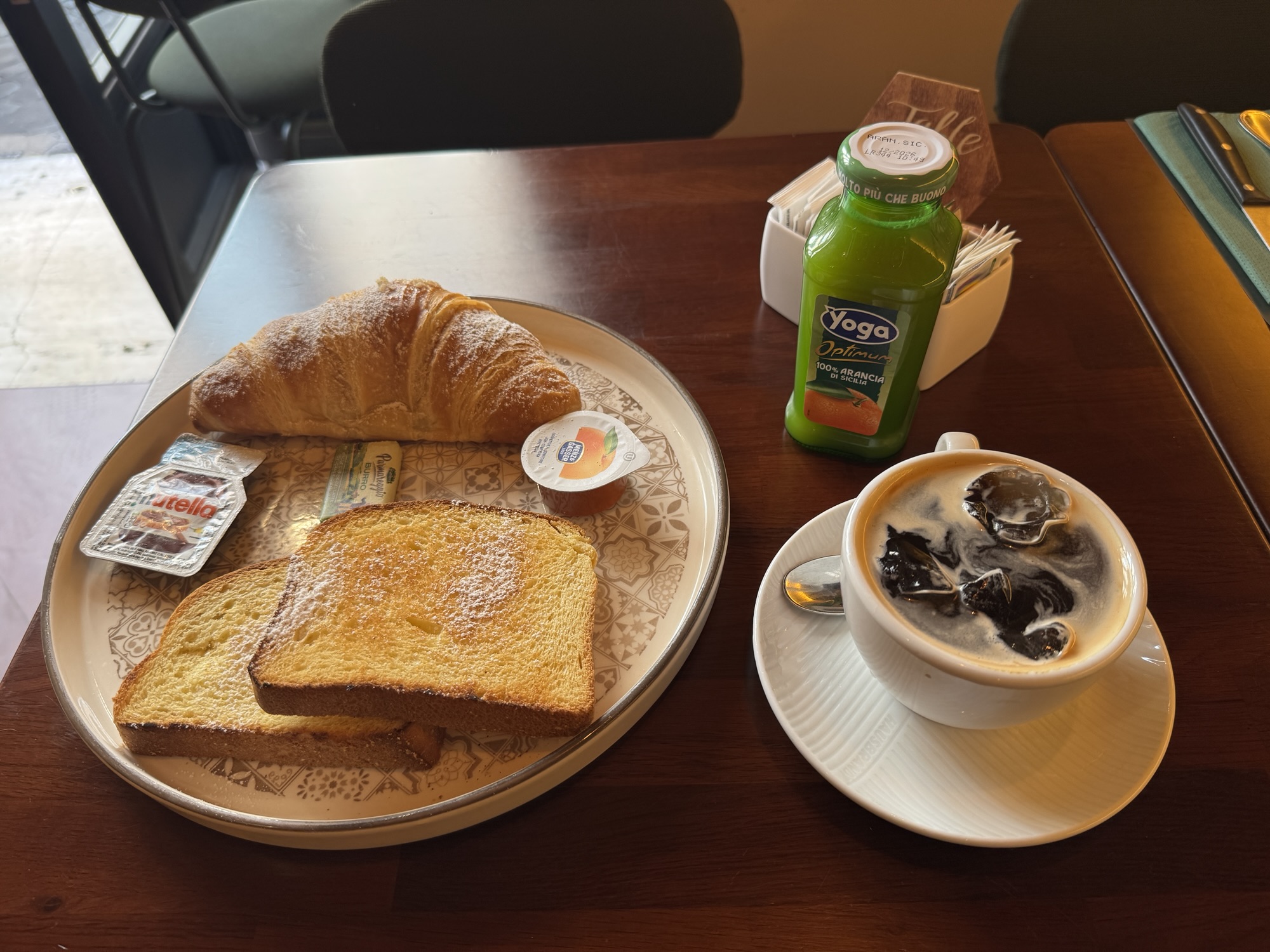 通りに「イタリアンブレークファースト」ってあったから、入ってみた。ドリンクも2つ選べて、これだった。9.5ユーロだから「あ、安い」って思ったんだけど、日本円で1800円だ。炭水化物パレード。考えてみたらイタリア名物はパスタとピザ。ぜーんぶ炭水化物だな。