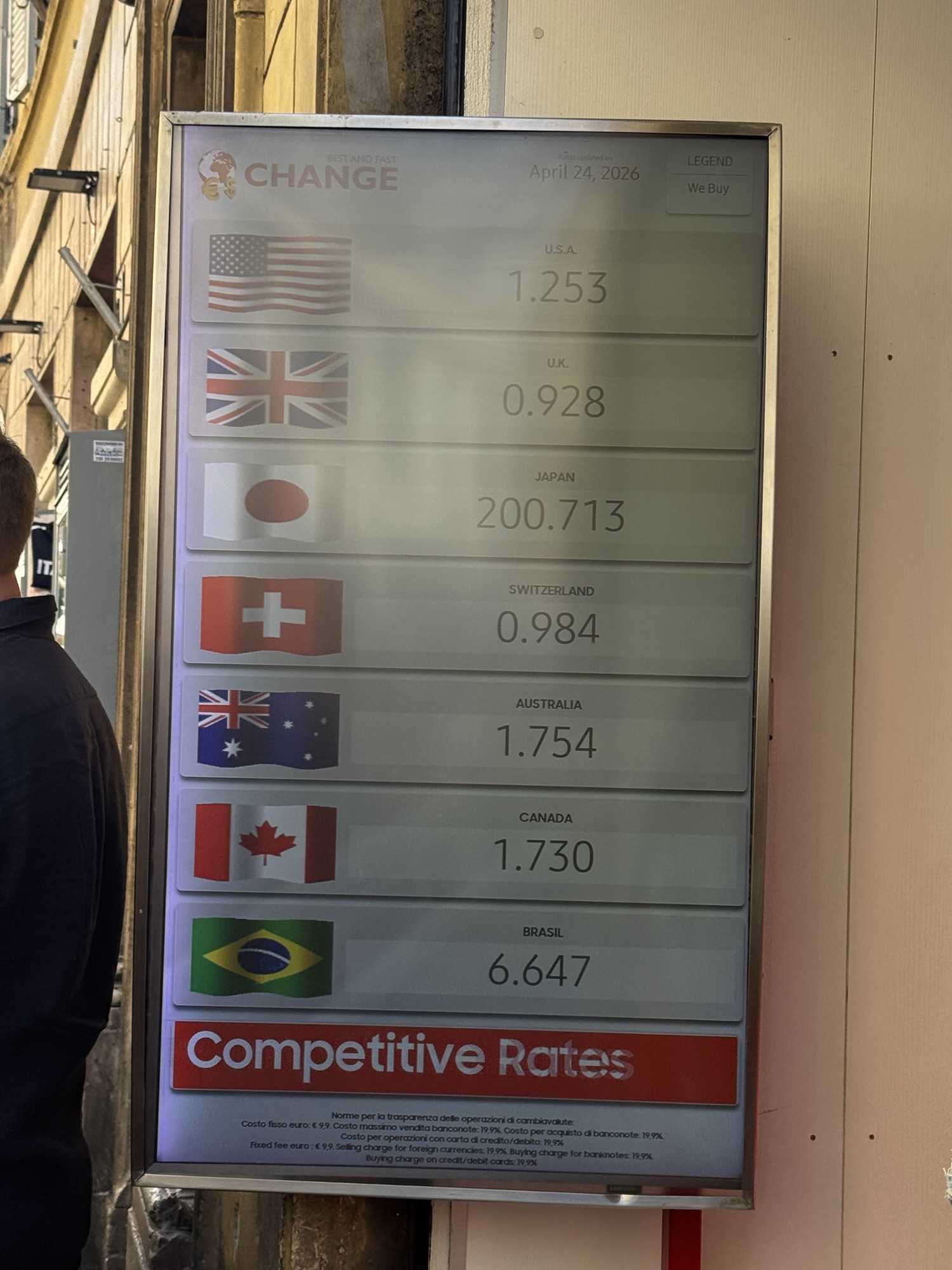 1ユーロを買うのに200円以上かかるらしい。(写真が不鮮明で申し訳ない)俺は両替商で1ユーロを178円とかで手に入れてきた。あのボランティアみたいな趣味も旅行に役立つなんて嬉しい!