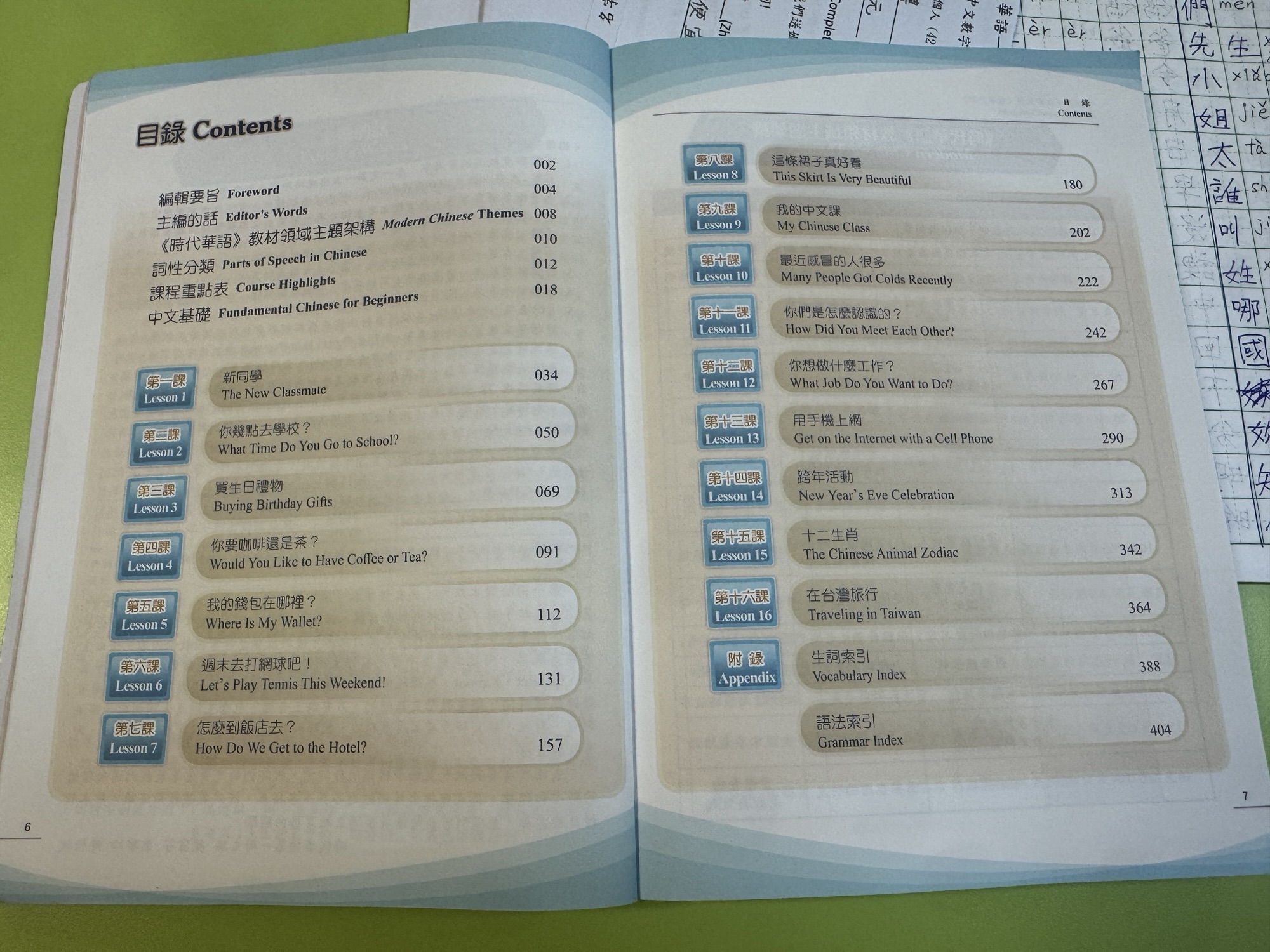 台湾では外国人に語学を教える大学が沢山ある。でも、そのカリキュラムは統一されているらしい。どの大学で受講しても同じ。先生に当たりハズレはあるだろうけどね。(写真はテキストの目次)