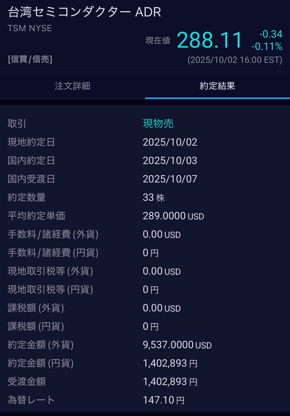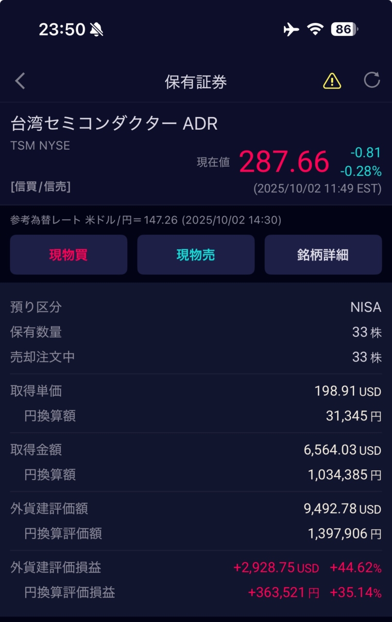 昨夜187.66USD付近をウロウロしているお気に入りの株を1株189USDで売りに出してたら約定してた。しかも、その指値は絶妙だった!うぇーい。