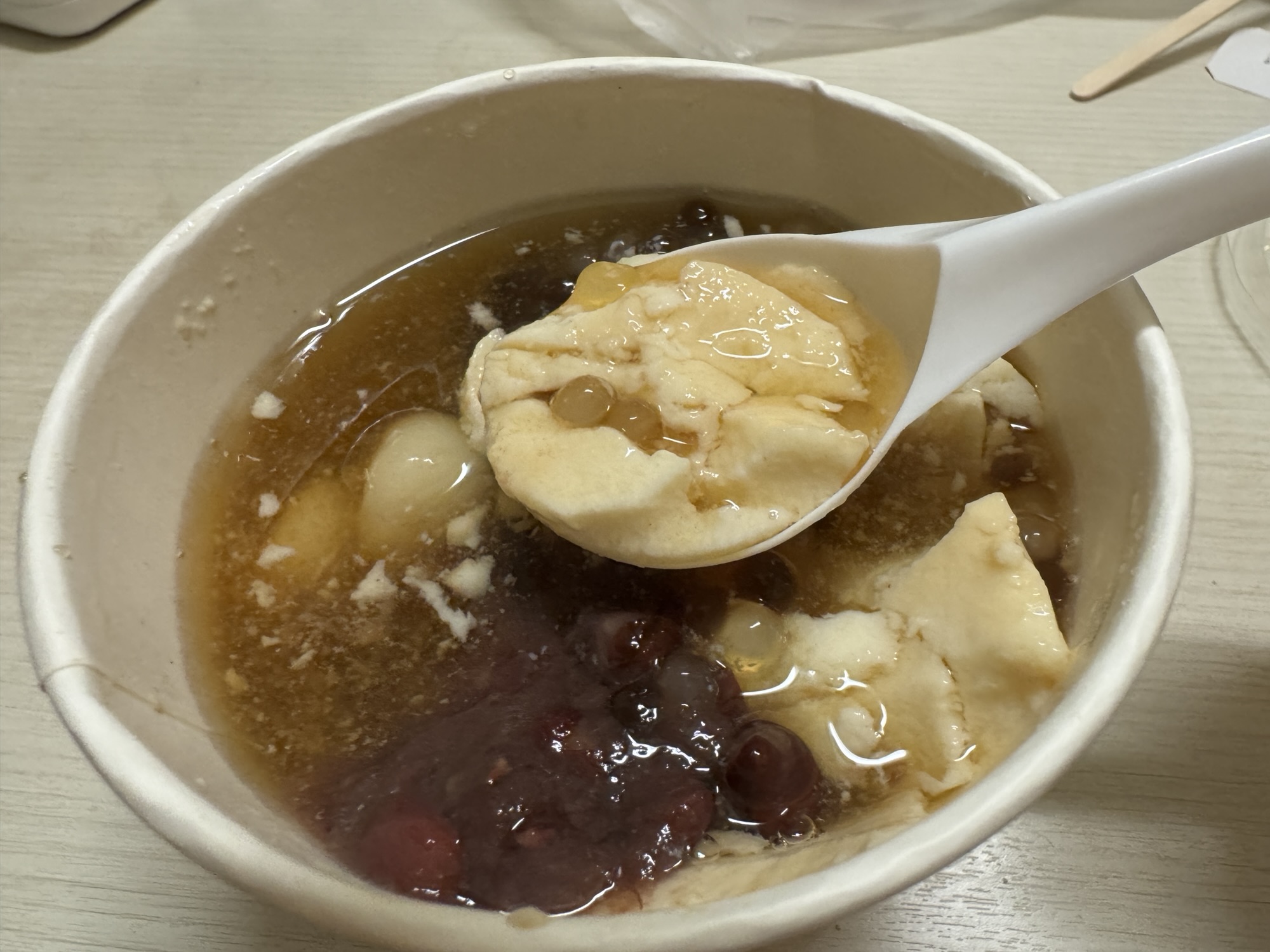 豆腐ってさ、日本食として欠かせないよね。でも、豆腐をデザートで食べるって発想、日本人には無いよね。台湾ではたぶんデザートで食べる方が多いと思う。しかも、豆腐って呼ばないんだよ。豆花(とうふぁ)って言うの。考えてみたらさ、食べ物なのに腐って感じは不適当だよね。豆花、めっちゃセンスいいと思う。で、食後のデザート。