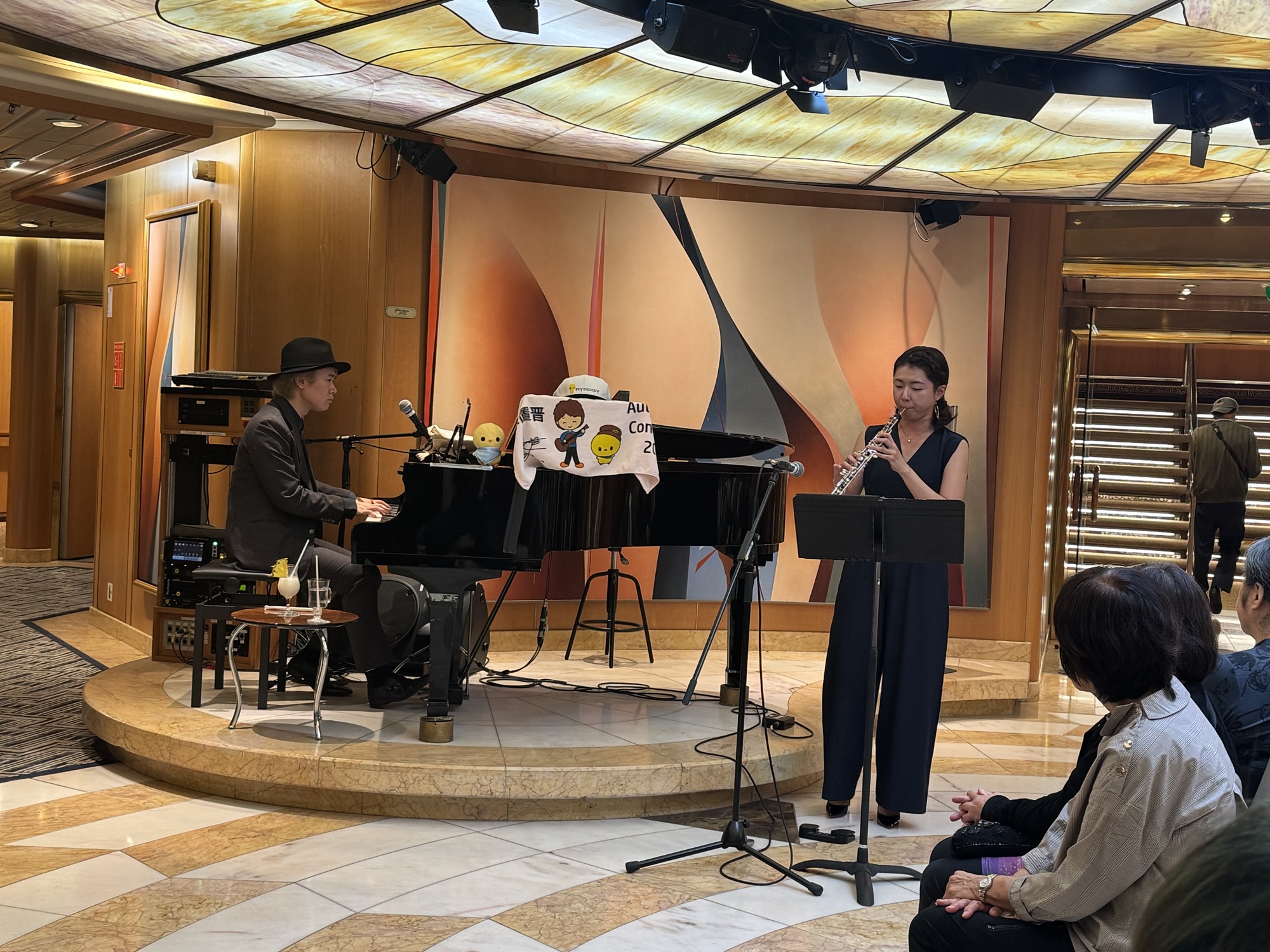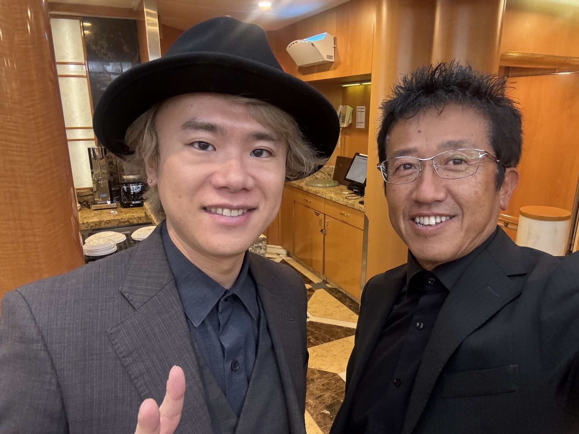 私の船旅を豊かにしてくれたピアニストのシンさん。明日、神戸で船を降りる。残念だ。だから今日は彼の最後のステージを楽しむことにした。写真もご一緒してもらった。