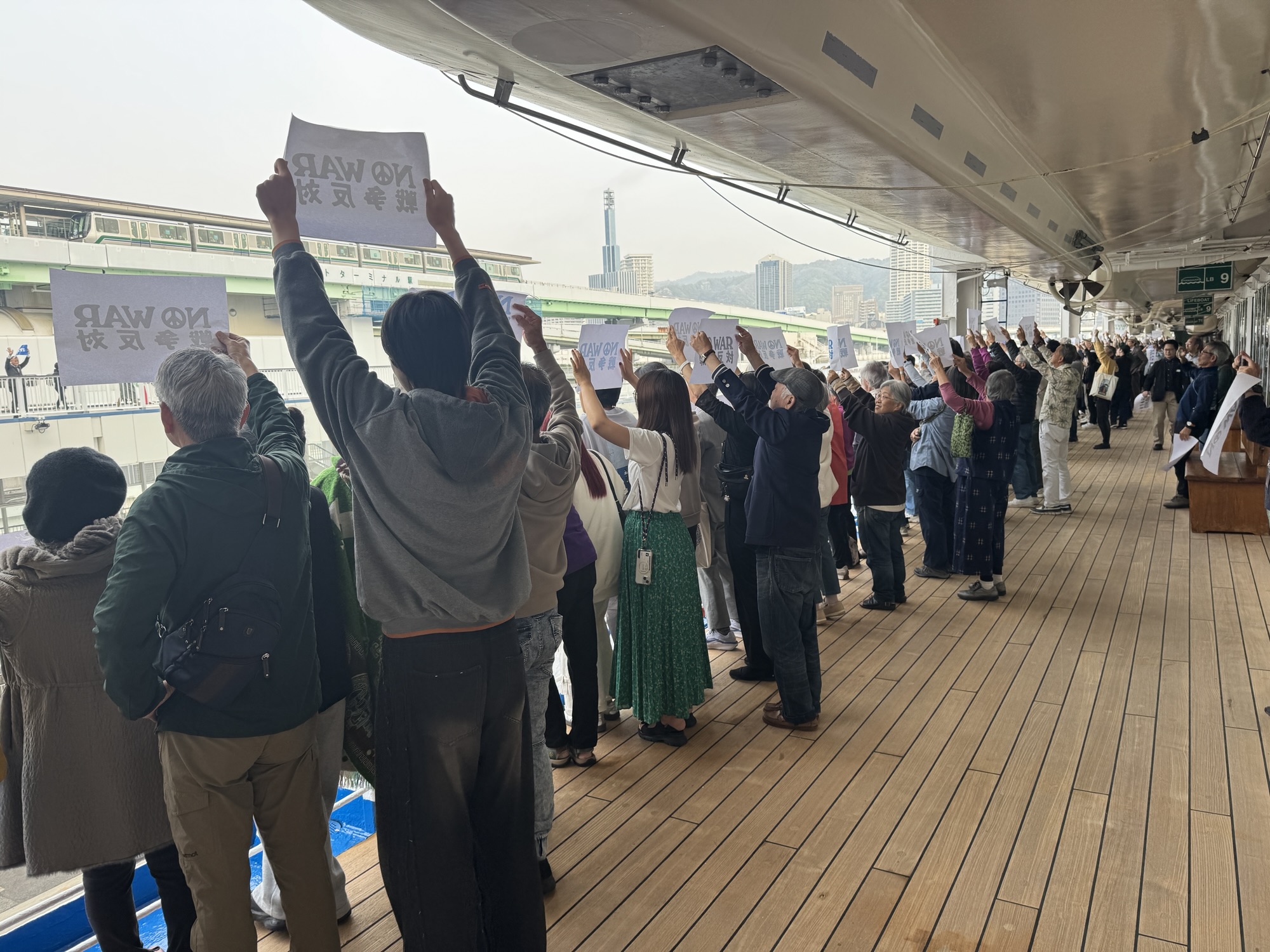 神戸寄港にあたり、世界の平和を願いアピールする取り組みがあった。自由参加だ。ピースボートに乗ってる人のほとんどは平和活動に興味はない。ただの浮かぶ老人ホームだし、武力や核兵器が平和を守ってると信じている人が多い、、、そう思っていたが、意外にもたくさんの人が参加してた。