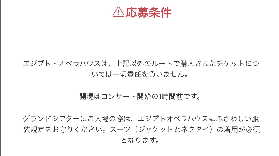 俺は直接オペラハウスに行ったんだ。そして「俺は日本人でツーリストなんだけど、旅だからスーツやネクタイは持ってきてないんだ。それでもコンサートやバレエの公演楽しむ方法ないかな」って聞いたら、フォーマルじゃないとダメだって剣もほろろだった。エジプトだっせー。